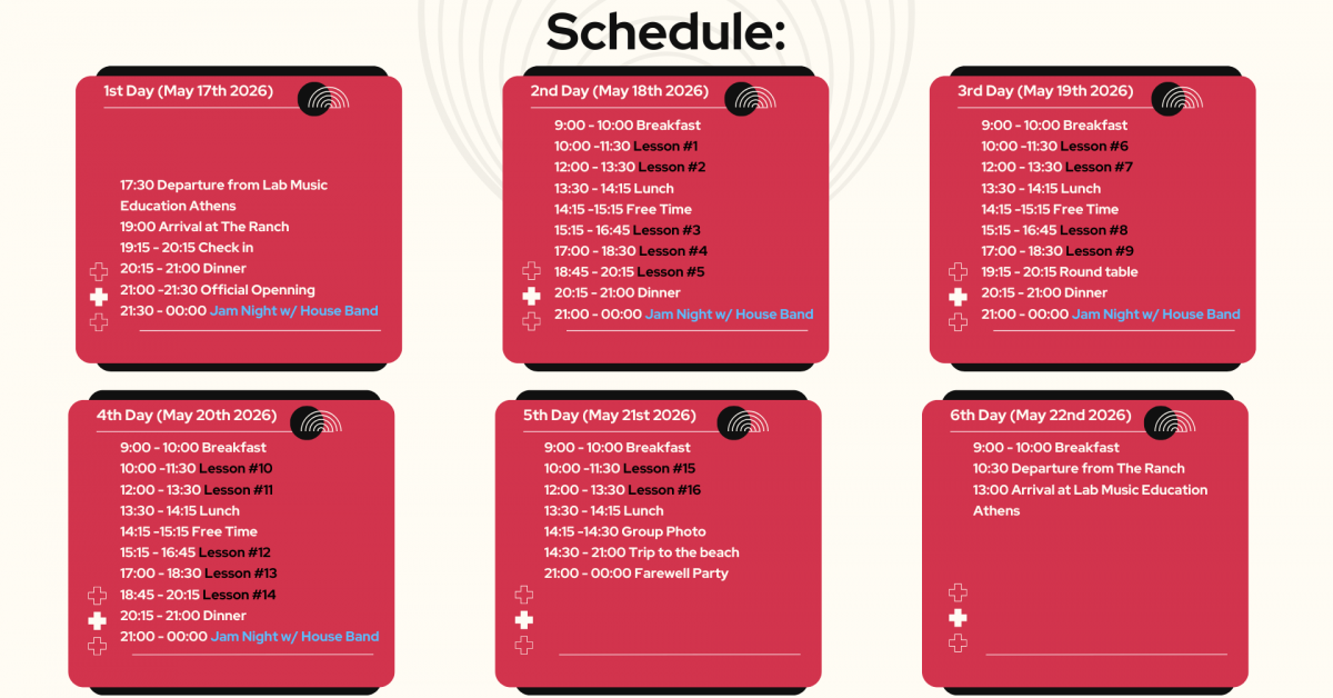 Transportation by bus from Athens to the Ranch (100 km) and back is included in the price. The bus will depart from Athens at 17.30 on the first day of the event and will depart from the Ranch to Athens at 10.30 on the last day the event is held.